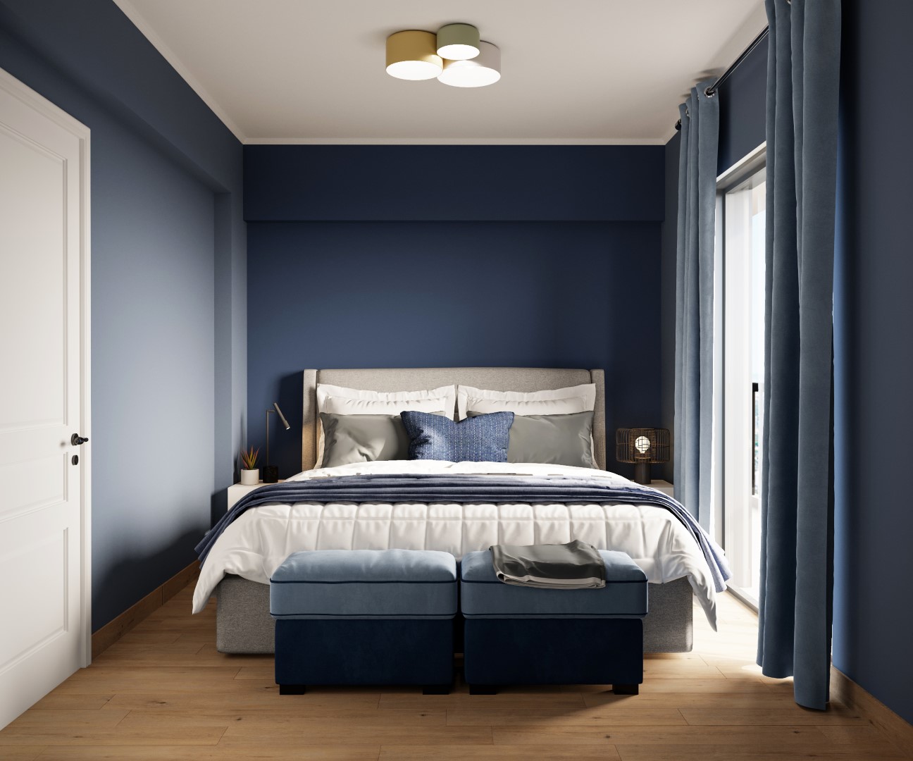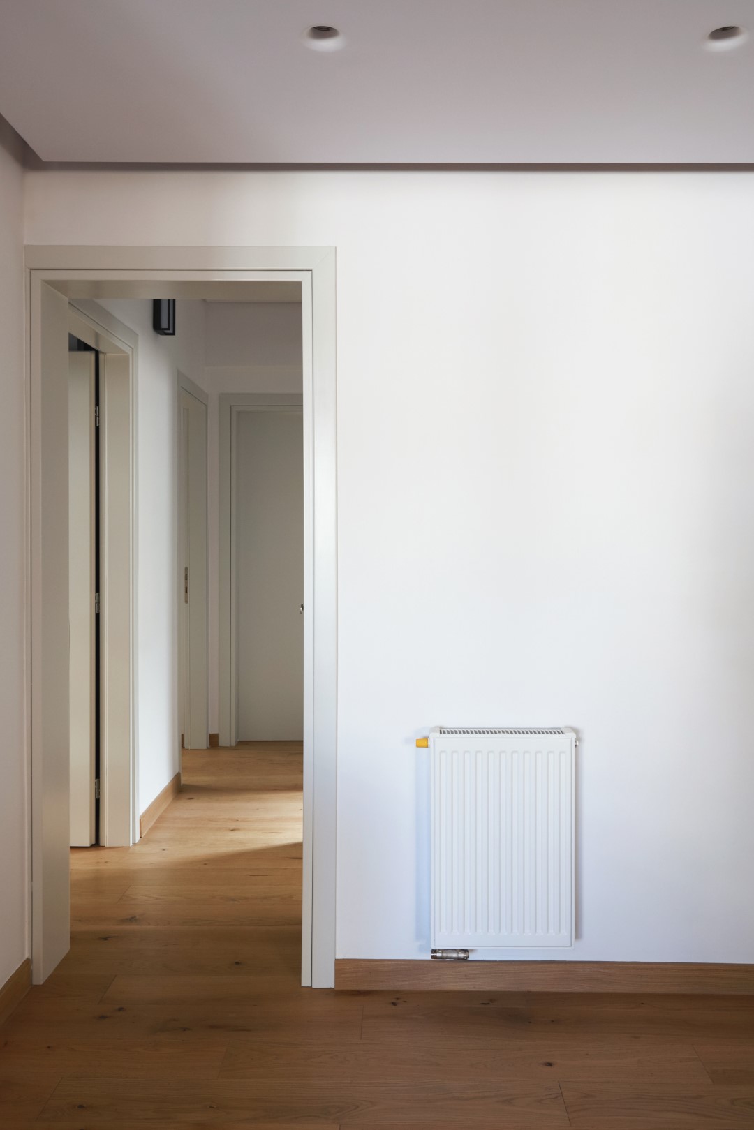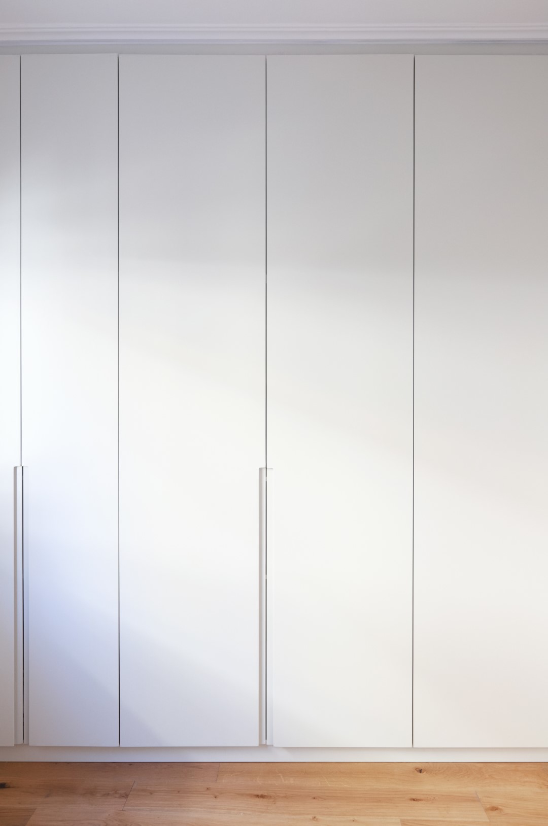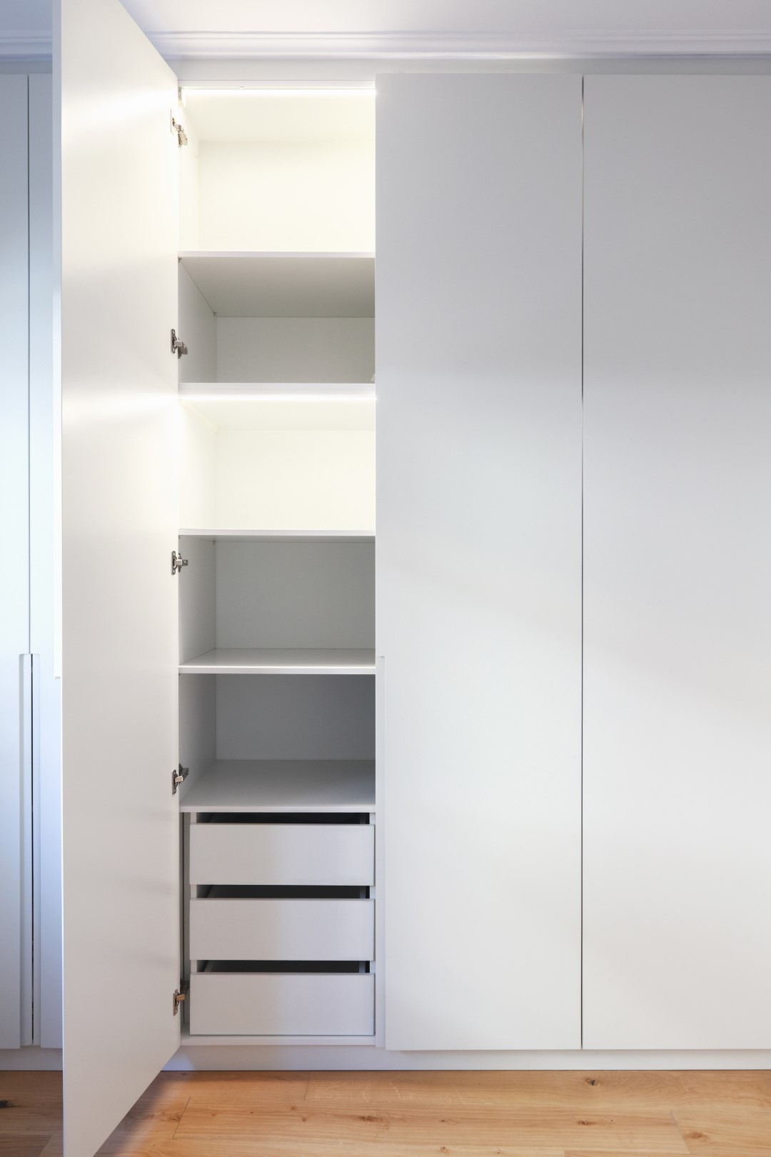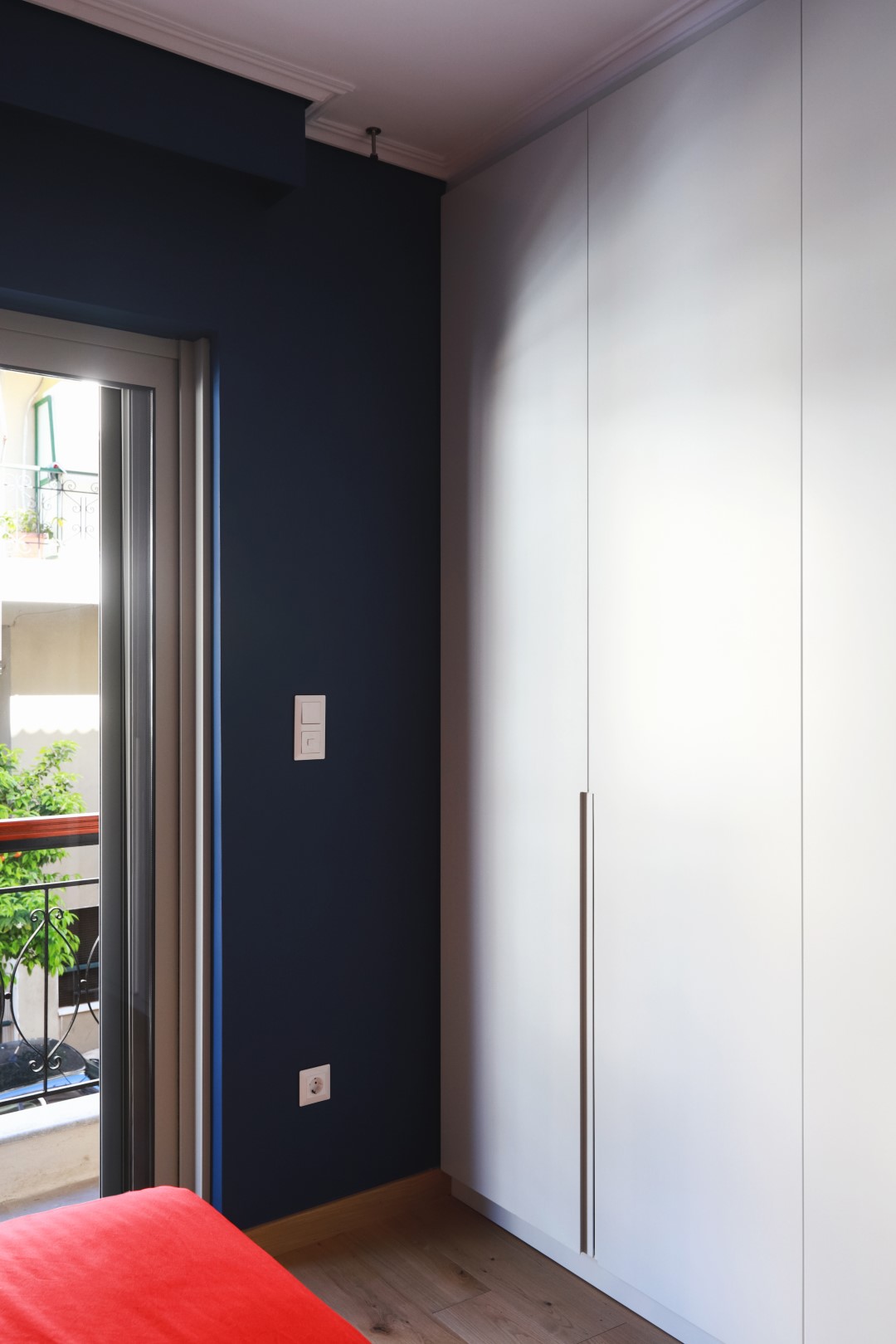 Η μίνιμαλ διάθεση ενισχύθηκε με τον custom made σχεδιασμό των ντουλαπιών των υπνοδωματίων, με τα μονοκόμματα καθ’ ύψος φύλλα και τον διακριτικό φωτισμό στο εσωτερικό τους για περισσότερη ατμόσφαιρα και άνεση. Στόχος ήταν η δημιουργία ενός χώρου που αποπνέει μια εσωτερική ηρεμία σαν κι αυτή του ιδιοκτήτη του.