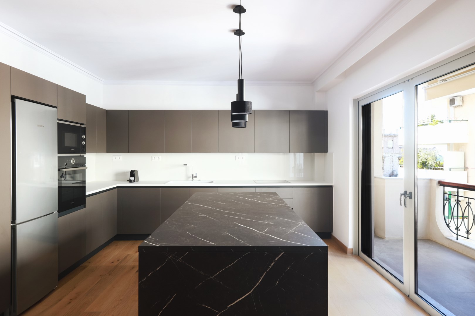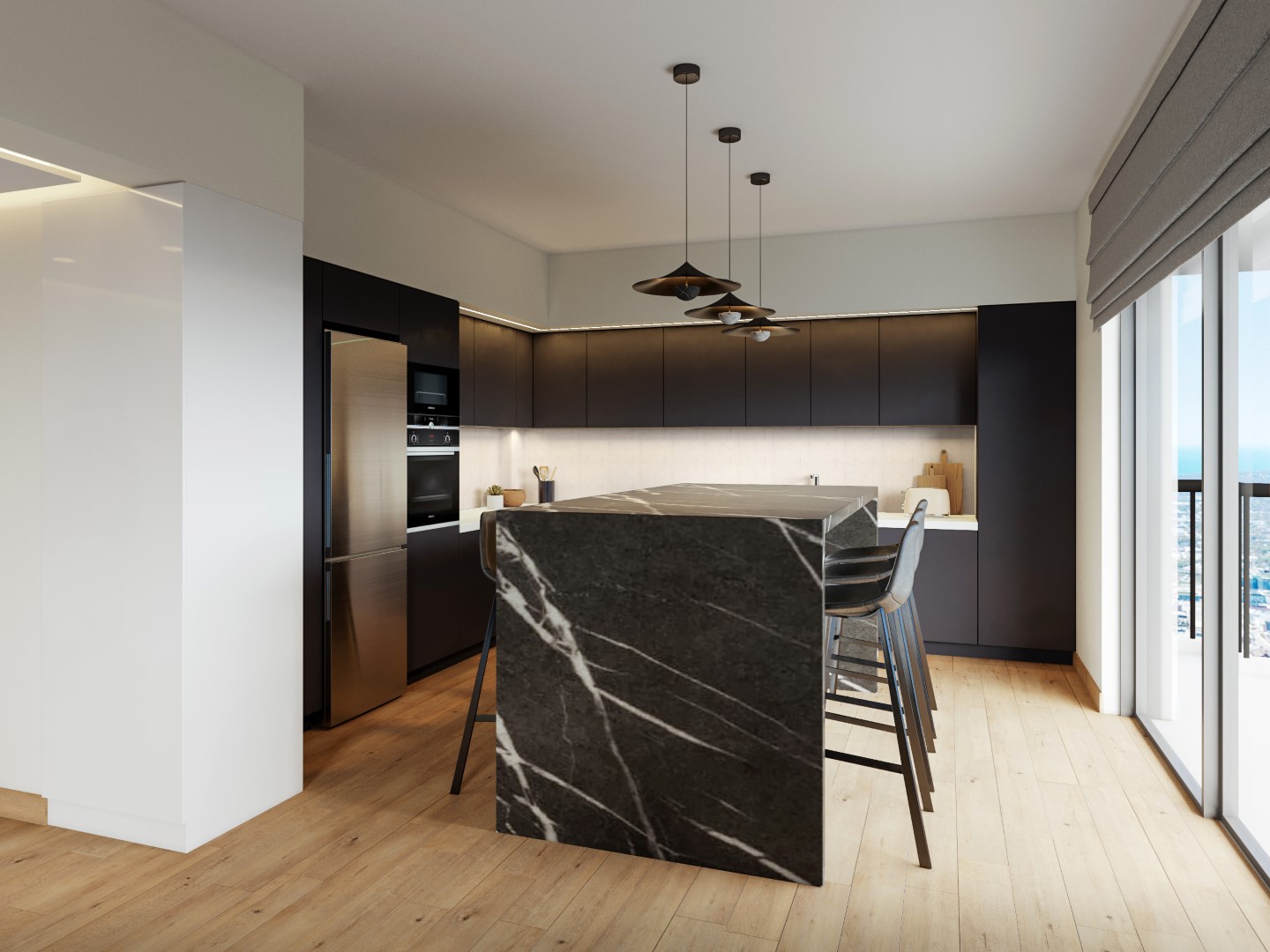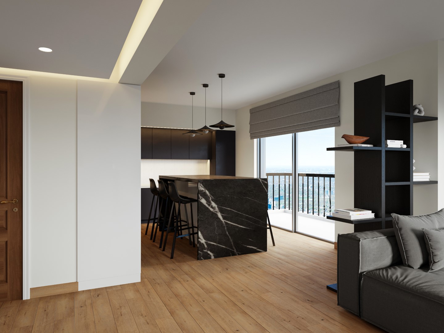 Το σαλόνι μαζί με την ανοιχτή κουζίνα διαμορφώθηκαν στα μπροστινά μεγάλα ανοίγματα με τη θέα, προς εκμετάλλευση του φυσικού φωτός, ενώ οι ιδιωτικοί χώροι, το υπνοδωμάτιο, το γραφείο και το μπάνιο βρίσκονται στο πίσω μέρος. Δεν υπήρχε ανάγκη για τραπεζαρία, αλλά για μια open space κουζίνα που σχεδιάστηκε από την αρχή με κάθε λεπτομέρεια, συνδυάζοντας ανθρακί γκρι σε ματ υφή ντουλάπια, με γυαλιστερά λευκά πλακάκια τοίχου. Η νησίδα που βλέπει προς το σαλόνι, δεν είναι απλά ένα κομμάτι της κουζίνας, αλλά ένα σημαντικό έπιπλο στο χώρο, που τονίζεται και αποκτά ευδιάκριτη παρουσία με την επένδυση σε απομίμηση μαρμάρου, μαύρου με λευκά νερά. Το μπάνιο ακολουθεί την ίδια χρωματική παλέτα και αισθητική. Το σκουρόχρωμο καφέ ξύλινο πάτωμα με τους έντονους ρόζους που τοποθετήθηκε σε όλο το σπίτι, εκτός του μπάνιου, δημιουργεί μια πιο cozy ατμόσφαιρα. Οι λευκοί τοίχοι και ο απαλός φωτισμός επικρατούν σε όλο το σπίτι με εξαίρεση το υπνοδωμάτιο που βάφτηκε με ένα σκούρο βαθύ μπλε για να διαφοροποιηθεί.