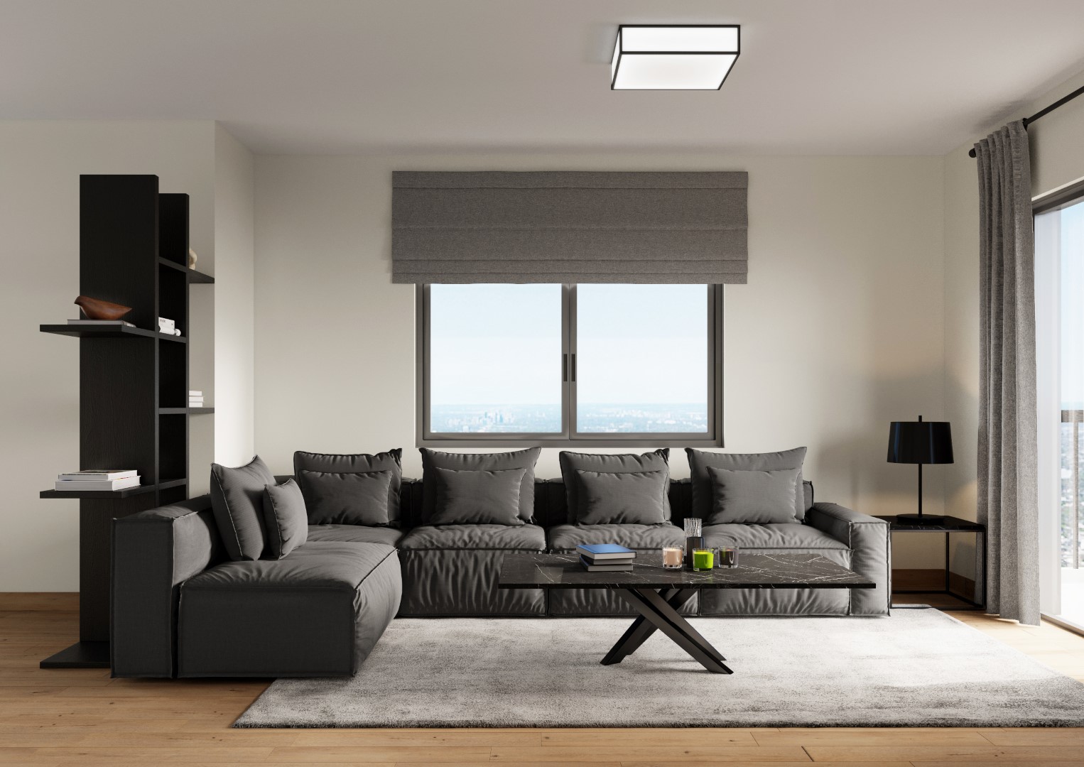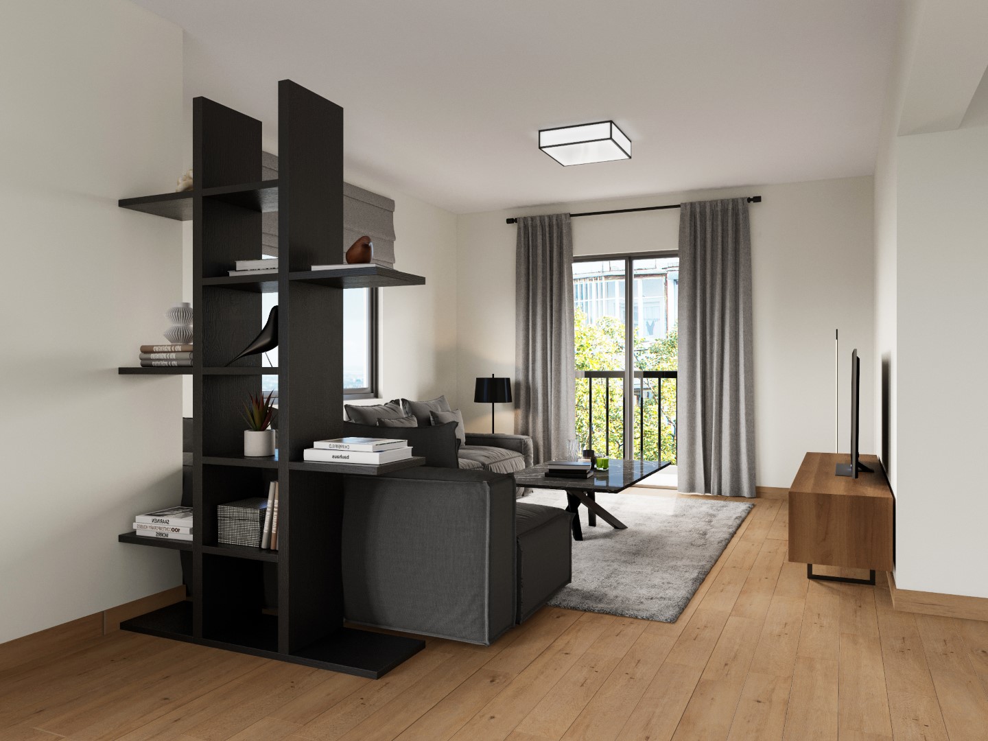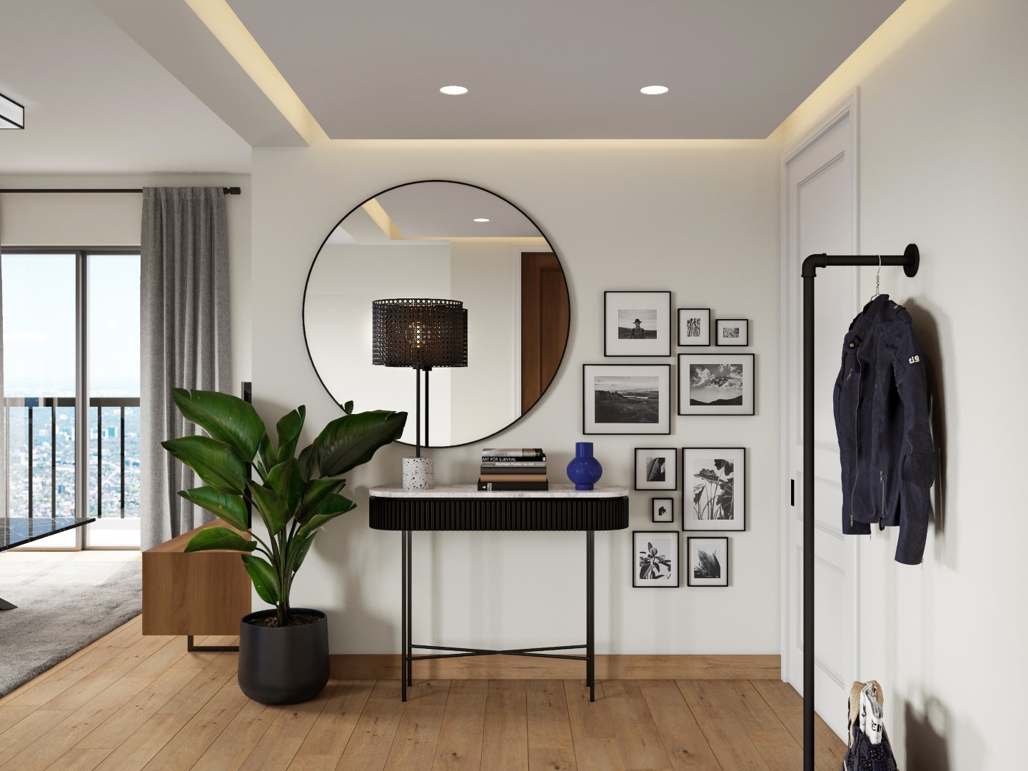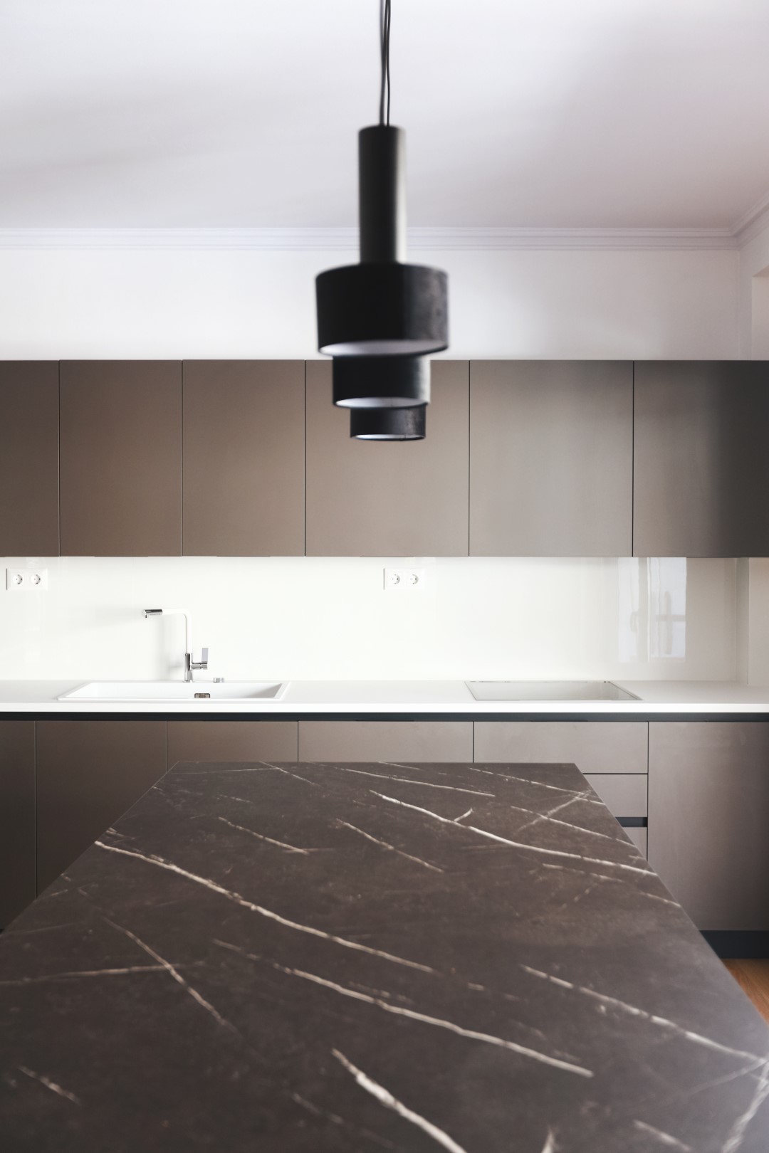 Το σαλόνι μαζί με την ανοιχτή κουζίνα διαμορφώθηκαν στα μπροστινά μεγάλα ανοίγματα με τη θέα, προς εκμετάλλευση του φυσικού φωτός, ενώ οι ιδιωτικοί χώροι, το υπνοδωμάτιο, το γραφείο και το μπάνιο βρίσκονται στο πίσω μέρος. Δεν υπήρχε ανάγκη για τραπεζαρία, αλλά για μια open space κουζίνα που σχεδιάστηκε από την αρχή με κάθε λεπτομέρεια, συνδυάζοντας ανθρακί γκρι σε ματ υφή ντουλάπια, με γυαλιστερά λευκά πλακάκια τοίχου. Η νησίδα που βλέπει προς το σαλόνι, δεν είναι απλά ένα κομμάτι της κουζίνας, αλλά ένα σημαντικό έπιπλο στο χώρο, που τονίζεται και αποκτά ευδιάκριτη παρουσία με την επένδυση σε απομίμηση μαρμάρου, μαύρου με λευκά νερά. Το μπάνιο ακολουθεί την ίδια χρωματική παλέτα και αισθητική. Το σκουρόχρωμο καφέ ξύλινο πάτωμα με τους έντονους ρόζους που τοποθετήθηκε σε όλο το σπίτι, εκτός του μπάνιου, δημιουργεί μια πιο cozy ατμόσφαιρα. Οι λευκοί τοίχοι και ο απαλός φωτισμός επικρατούν σε όλο το σπίτι με εξαίρεση το υπνοδωμάτιο που βάφτηκε με ένα σκούρο βαθύ μπλε για να διαφοροποιηθεί.