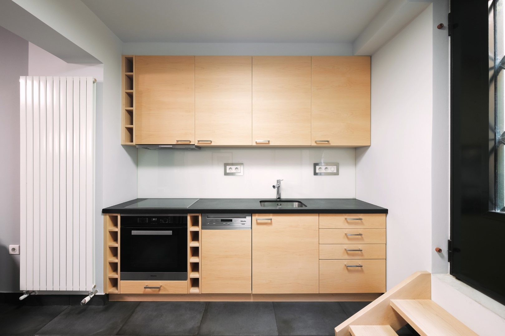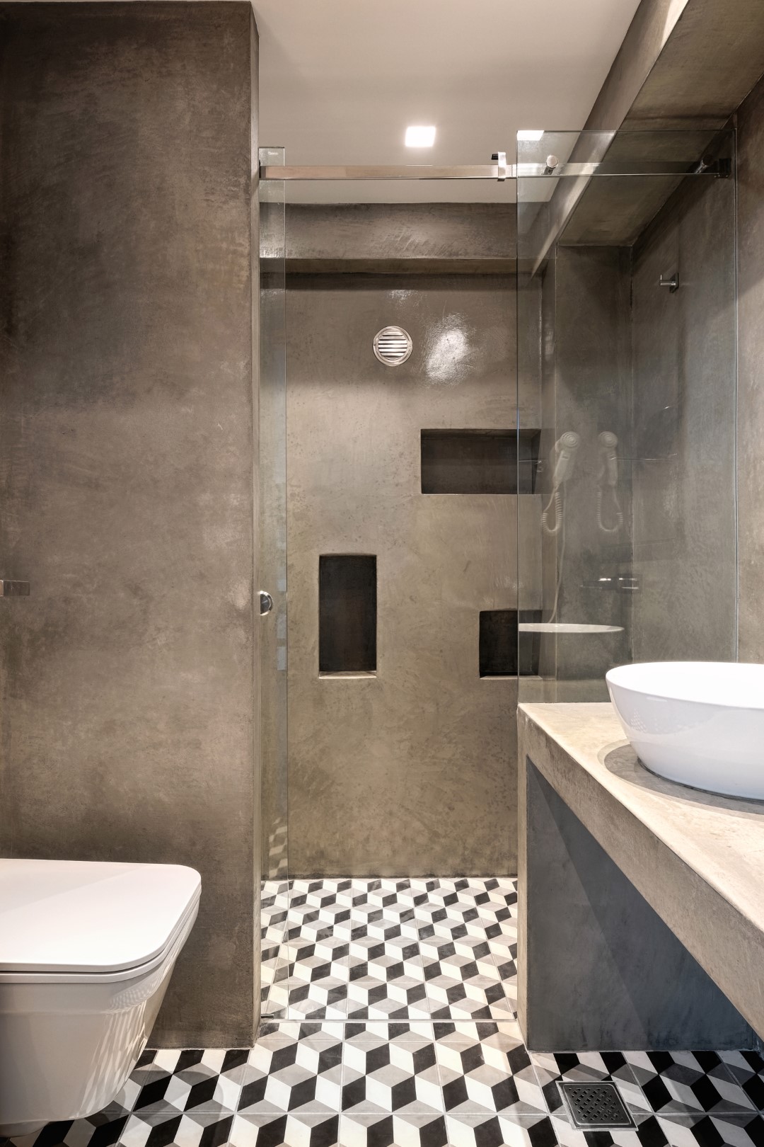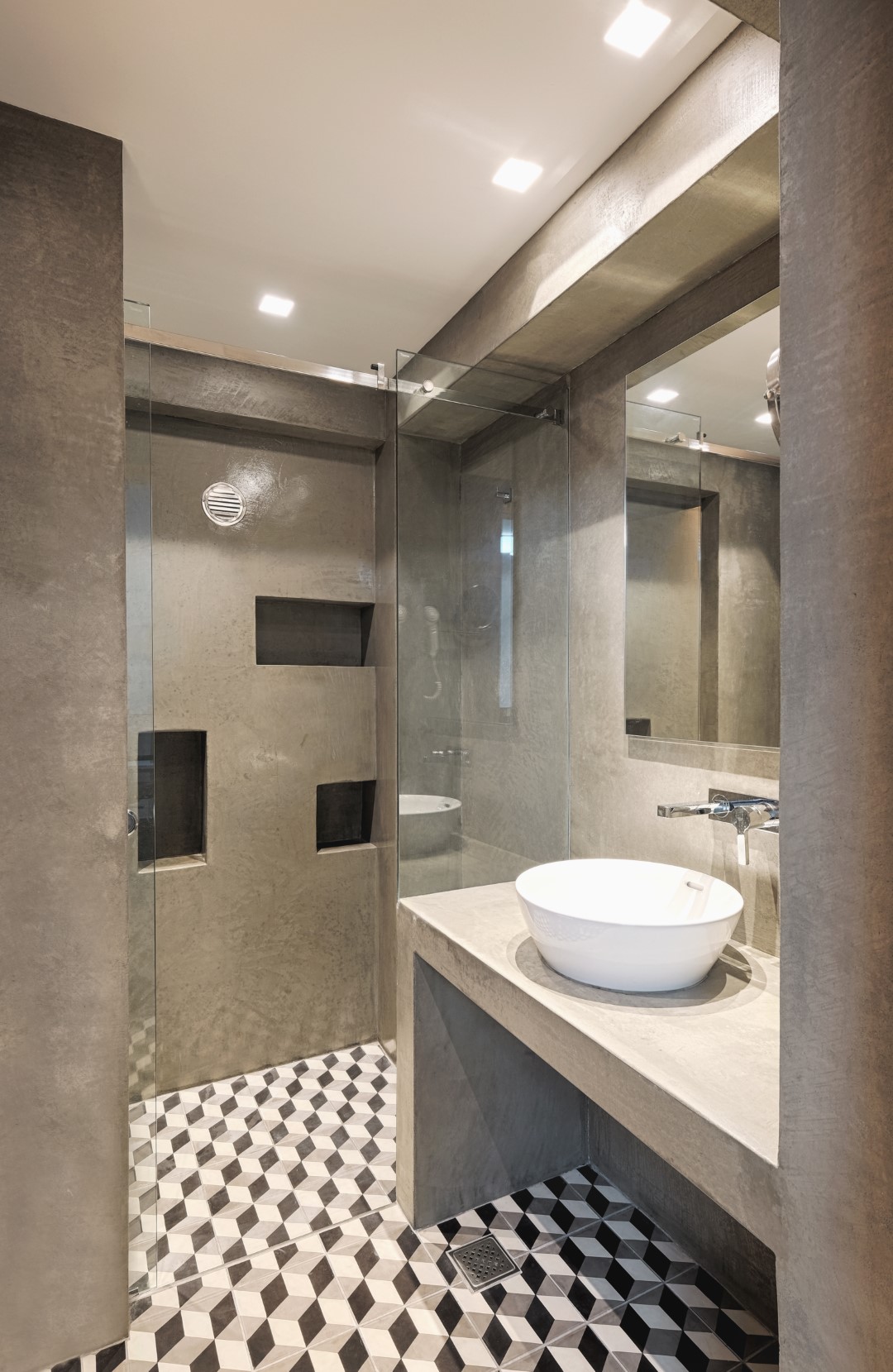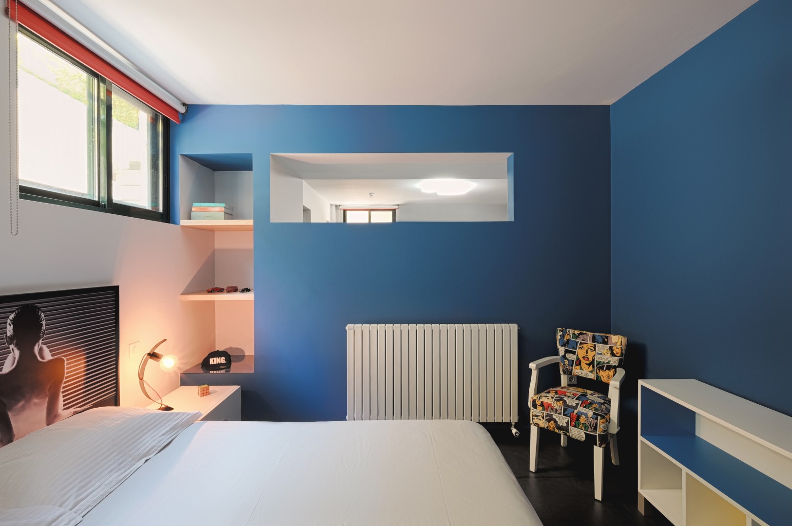 Όλα τα παραπάνω συνετέλεσαν στη διαμόρφωση ενός σύγχρονου open space στούντιο, που αν και μικρό διατηρεί τον διαχωρισμό των χώρων. Είναι λειτουργικό με εντοιχισμένους αποθηκευτικούς χώρους, όπως με τις εσοχές στον τοίχο του χωλ, στο υπνοδωμάτιο και στο σαλόνι αντίστοιχα. Η αίσθηση της συνεχούς κίνησης και δραστηριότητας του χώρου έρχεται σε απόλυτη ισορροπία με την ενέργεια που αποπνέει ο ιδιοκτήτης του.