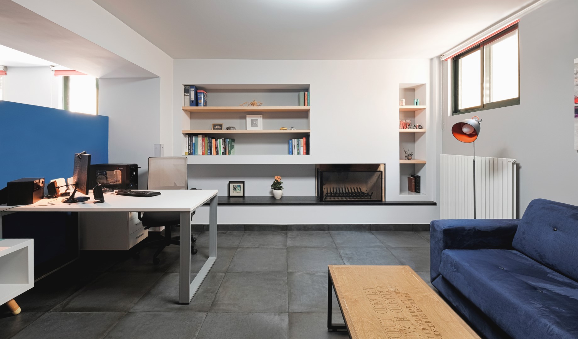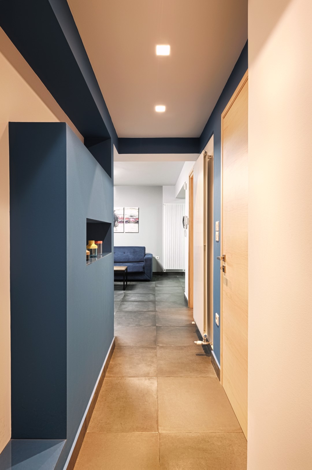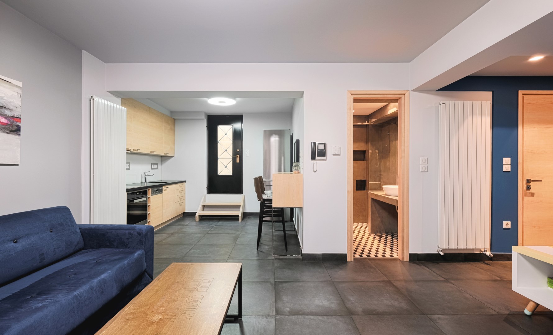 Στο στούντιο επικράτησε το σύγχρονο Bauhaus στυλ, με γεωμετρικές γραμμές, χαμηλά έπιπλα, ουδέτερα χρώματα που διαταράσσονται από έντονες λεπτομέρειες. Οι βαμένοι μπλε και λευκό χρώμα τοίχοι, το γκρι τσιμεντοπλακάκι στο πάτωμα, η τεχνοτροπία της γκρι πατητής τσιμεντοκονίας στο μπάνιο, σε συνδυασμό με το ασπρόμαυρο ρετρό πλακάκι δαπέδου, το φυσικό δρυς ξύλο της κουζίνας, η μεγάλη κατά μήκος λευκή γυαλιστερή ντουλάπα στο υπνοδωμάτιο, τα κόκκινα στόρια, ο πίνακας στο σαλόνι, προσδίδουν στο χώρο τη ζωντάνια που προσδοκούσε να δώσει η Άρτεμις. Ιδιαίτερο στοιχείο αποτελούν τα δύο custom made έπιπλα, αυτό της τηλεόρασης στο σαλόνι και η κονσόλα στο υπνοδωμάτιο με τα χρωματιστά μίνιμαλ γεωμετρικά μοτίβα.