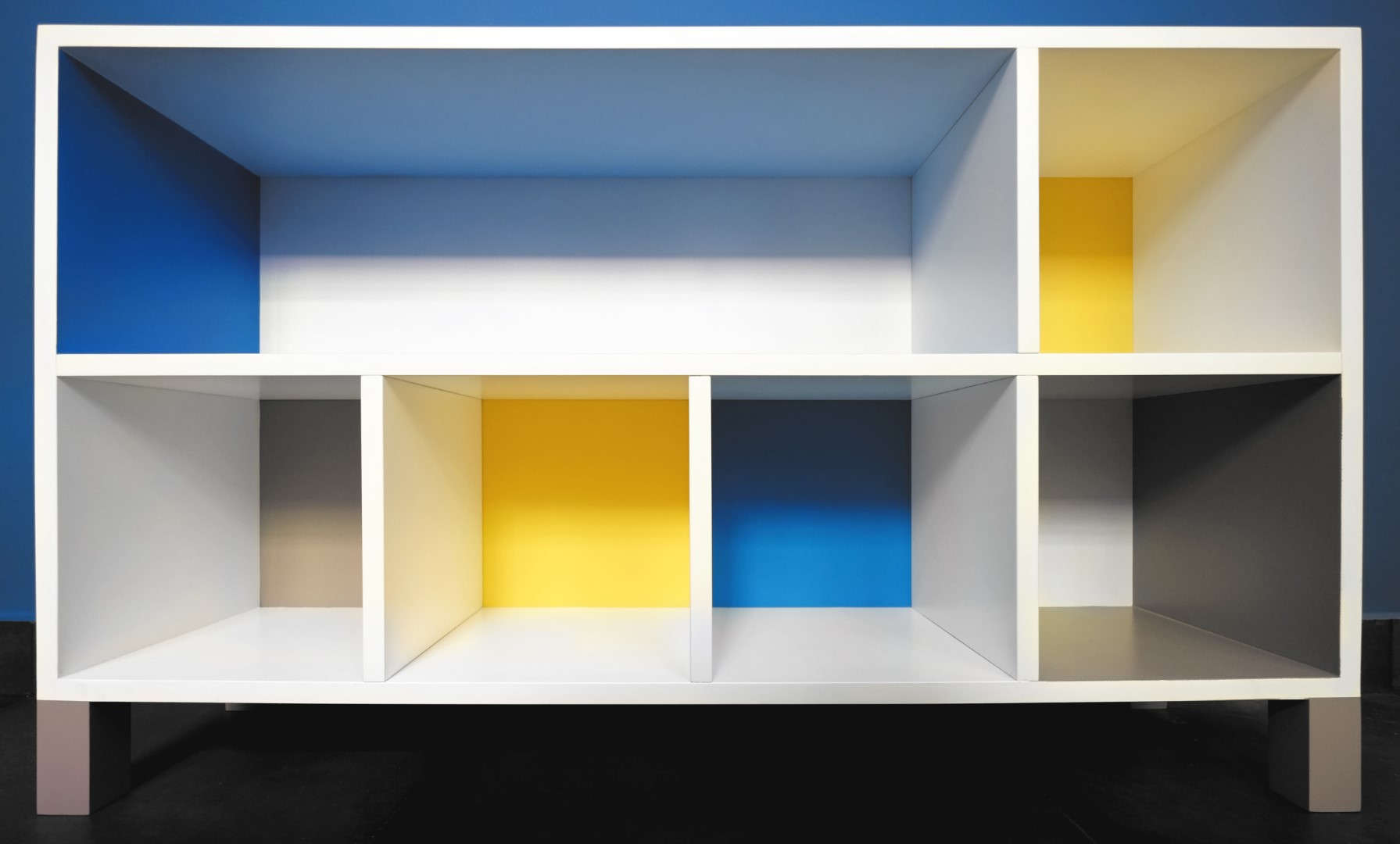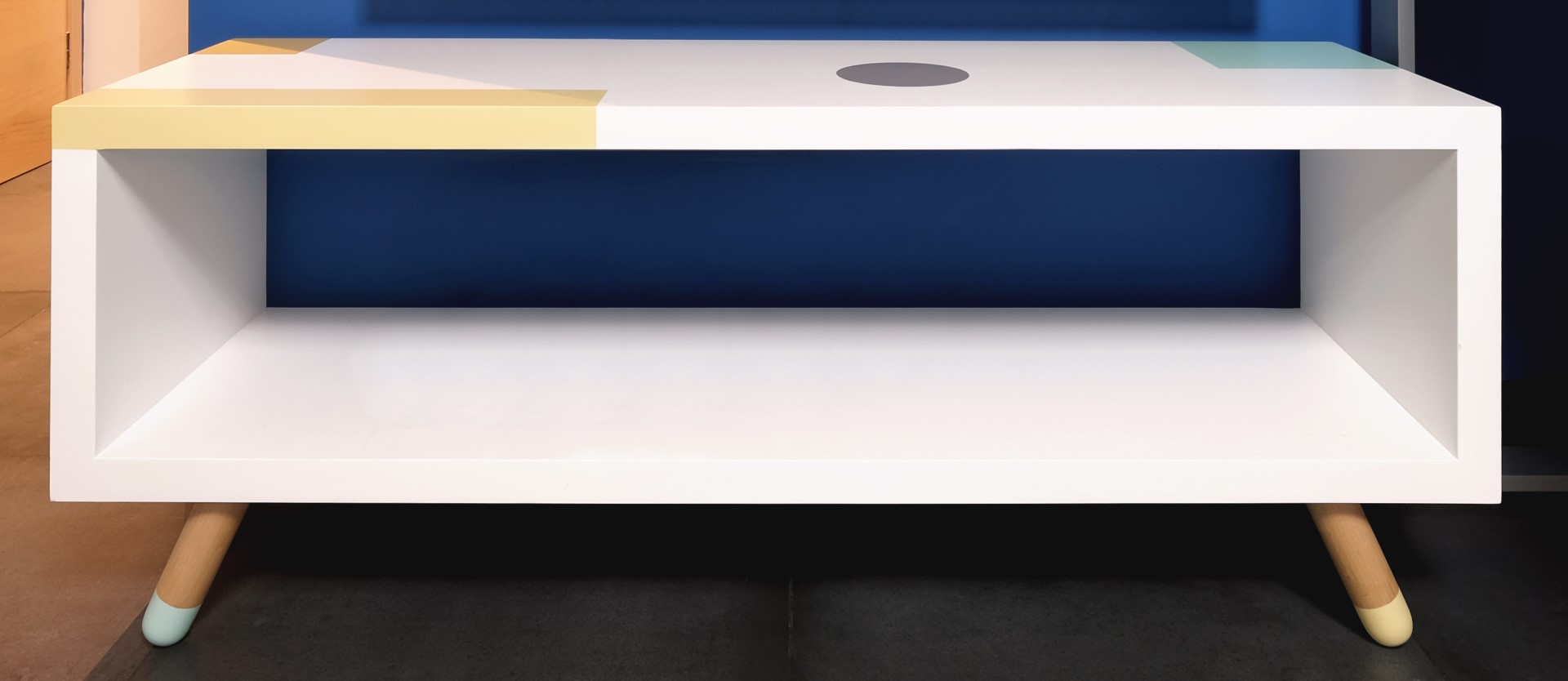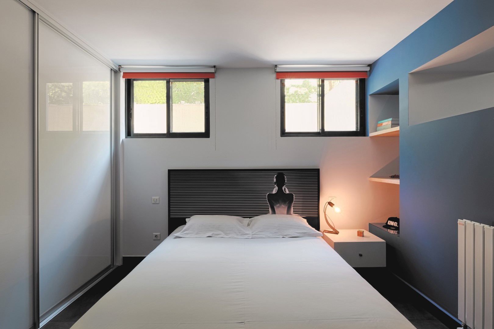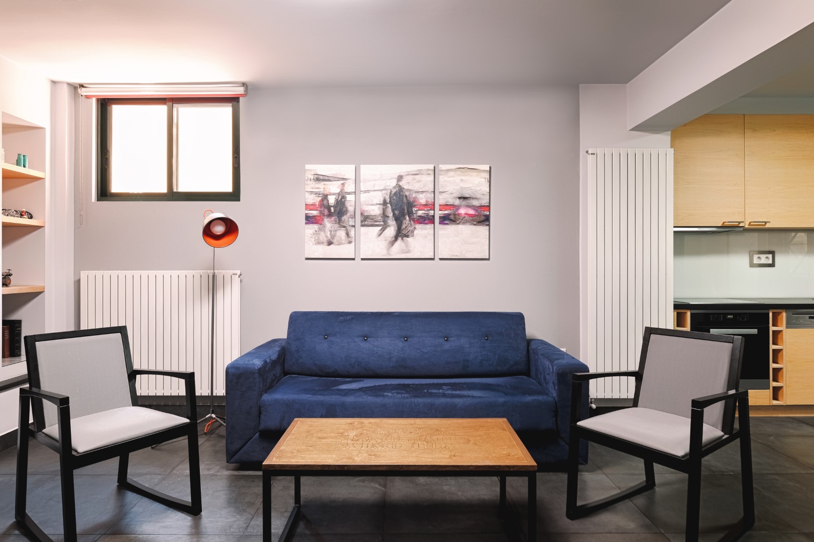 Στο στούντιο επικράτησε το σύγχρονο Bauhaus στυλ, με γεωμετρικές γραμμές, χαμηλά έπιπλα, ουδέτερα χρώματα που διαταράσσονται από έντονες λεπτομέρειες. Οι βαμένοι μπλε και λευκό χρώμα τοίχοι, το γκρι τσιμεντοπλακάκι στο πάτωμα, η τεχνοτροπία της γκρι πατητής τσιμεντοκονίας στο μπάνιο, σε συνδυασμό με το ασπρόμαυρο ρετρό πλακάκι δαπέδου, το φυσικό δρυς ξύλο της κουζίνας, η μεγάλη κατά μήκος λευκή γυαλιστερή ντουλάπα στο υπνοδωμάτιο, τα κόκκινα στόρια, ο πίνακας στο σαλόνι, προσδίδουν στο χώρο τη ζωντάνια που προσδοκούσε να δώσει η Άρτεμις. Ιδιαίτερο στοιχείο αποτελούν τα δύο custom made έπιπλα, αυτό της τηλεόρασης στο σαλόνι και η κονσόλα στο υπνοδωμάτιο με τα χρωματιστά μίνιμαλ γεωμετρικά μοτίβα.